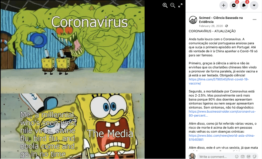 Começamos com uma publicação cuja imagem mostra um monstro assustador, que representa o COVID-19, e depois dois desenhos, um, assustado, o qual representa a comunicação social (“the media”). Depois vemos um outro boneco, que não está de todo assustado, boneco o qual representa o autor da publicação, que diz “Eu, que já viu o Vírus do Leste do Nilo, Gripe Suína, Gripa das Aves e a Ebola a aparecer e desaparecer em pouco tempo”. O tom está definido- esta publicação afirma claramente que a comunicação social está a exagerar a gravidade desta pandemia, a qual provavelmente vai desaparecer como aconteceu com estes outros vírus. Estava, obviamente, completamente errado.